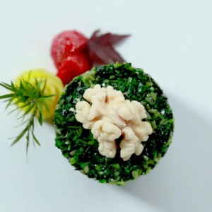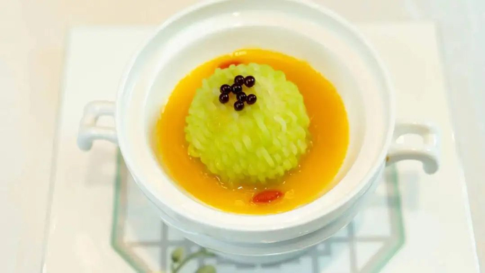传统美食狮子头是用肉末与小料手工制成的,在未改变主料的前提下将春季特色融入其中,绿色笋丝如丝织般包裹着狮子头,马蹄青笋与鳕鱼猪油搭配在一起产生了奇妙的平衡感。