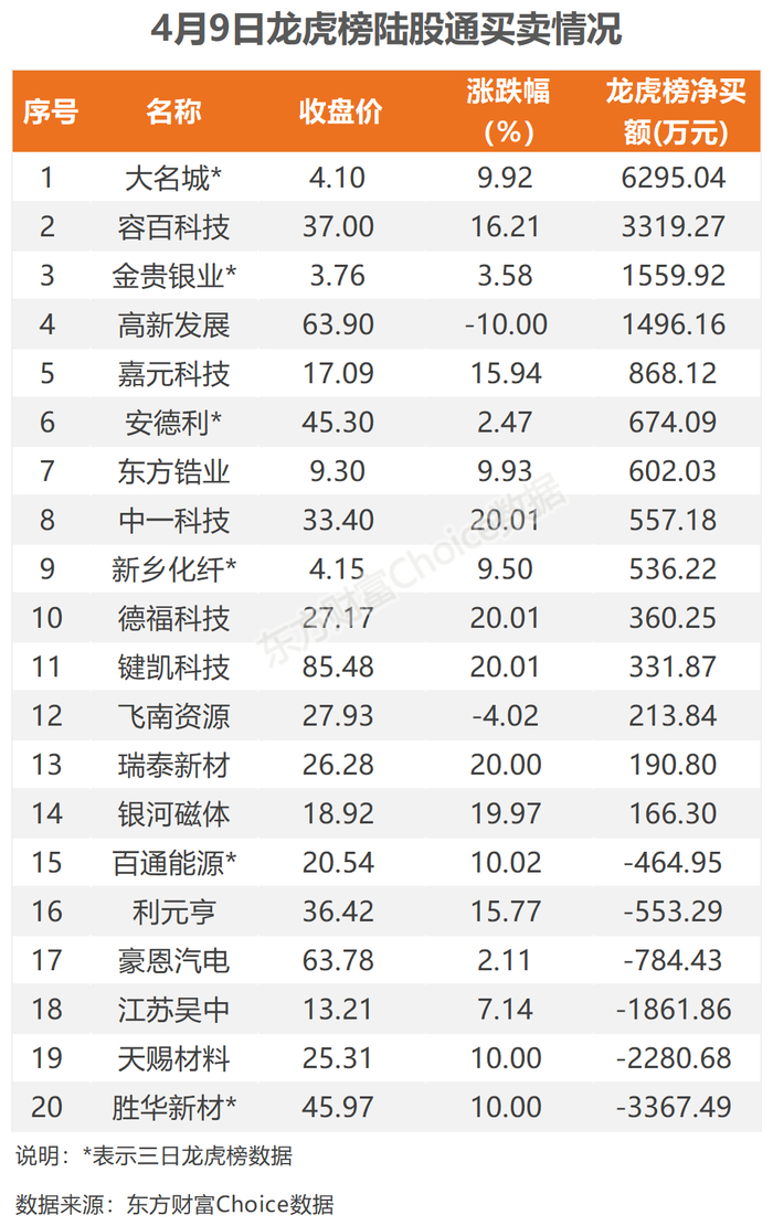 4月9日,陆股通参与龙虎榜中个股共涉及20股,其中14股被陆股通净买入,大名城被买入最多,三日净买入6295.04万元;另外6股被陆股通净卖出,胜华新材被卖出最多,三日净卖出3367.49万元。