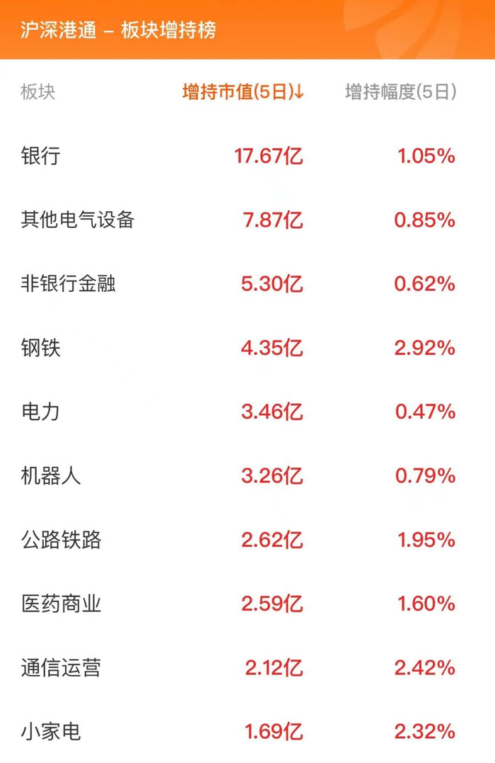 北向资金板块增持榜