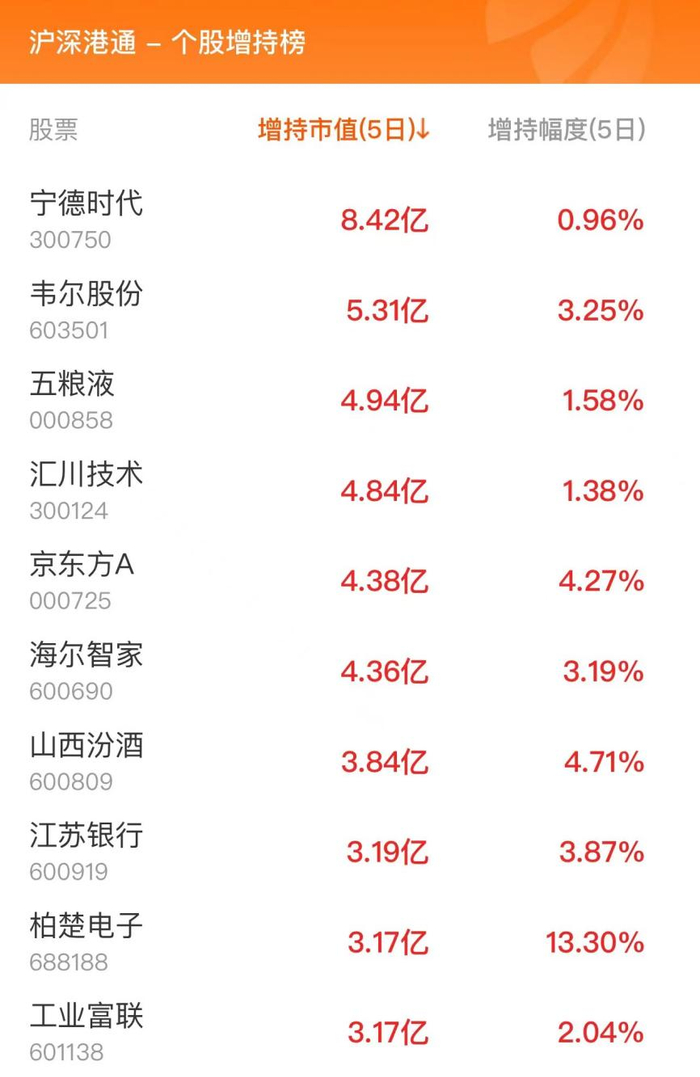 北向资金个股增持榜