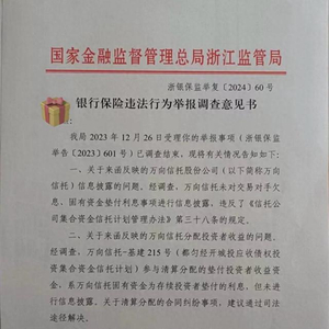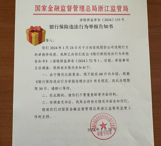 投资人反馈的问题包括,万向信托未提示标的项目不合规历史遗留问题、违规释放抵押物、信托资金挪作他用、项目风险暴露后不尽责等。浙江监管局3月末回复投资人称,由于情况复杂,相关举报事项不能在60日内办结,延长办理期限30日。