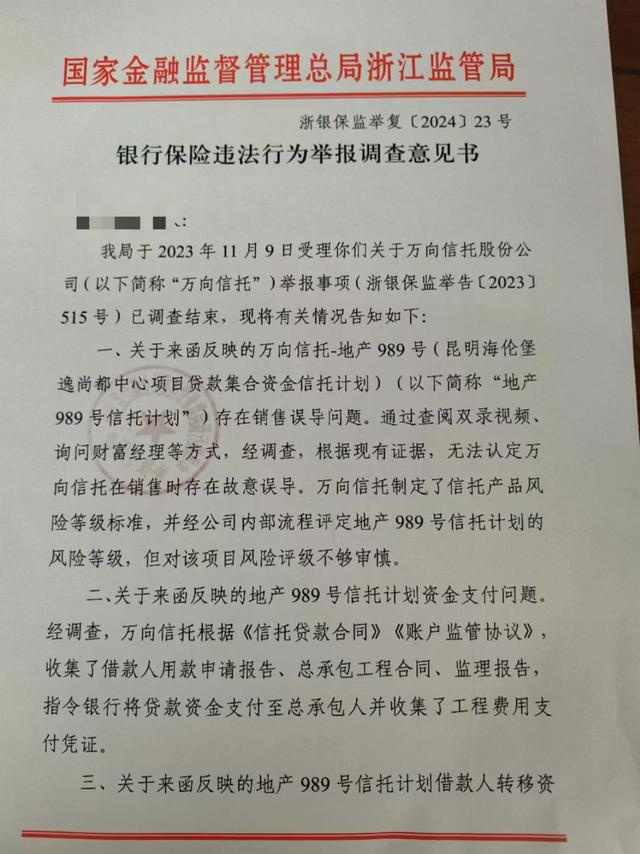 其中,针对万向信托地产989号产品投资人举报的问题,国家金融监督管理总局浙江监管局(下称“浙江监管局”)调查后发现,对于该信托计划借款人转移资产逃废债行为,万向信托作为受托人采取了相应措施,但向投资人信息披露不及时,另外,该信托计划“投资标的运行正常”的信息披露与事实不符。