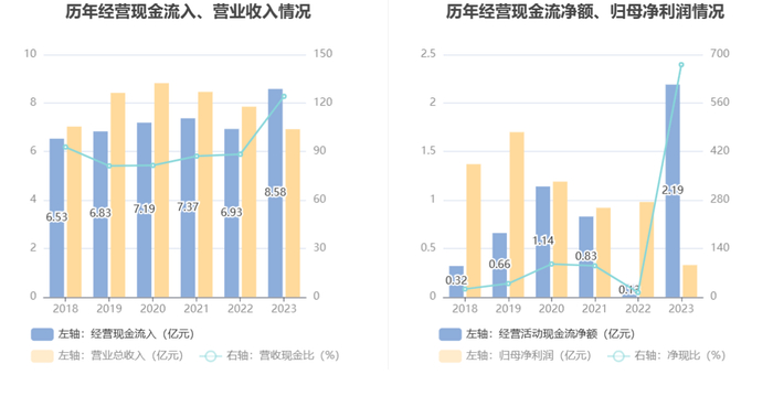 2023年,公司营业收入现金比为124.13%,净现比为670.79%。