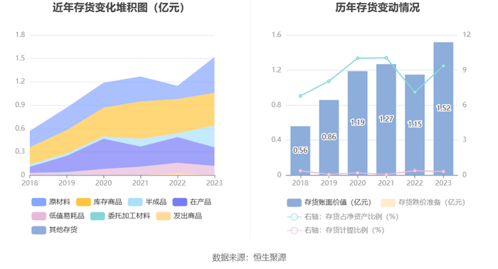 从存货变动来看,截至2023年年末,公司存货账面价值为1.52亿元,占净资产的9.37%,较上年末增加3692.11万元。其中,存货跌价准备为48.39万元,计提比例为0.32%。