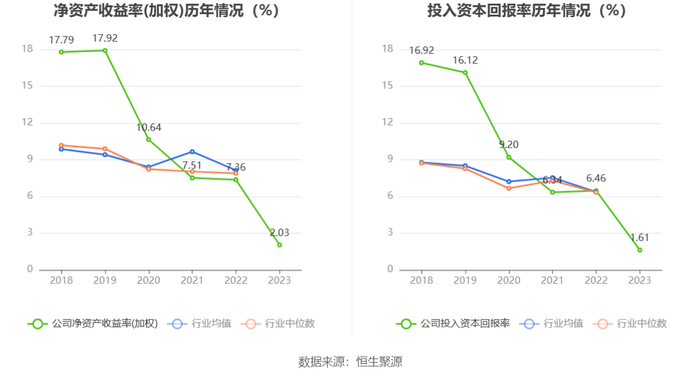 数据显示,2023年公司加权平均净资产收益率为2.03%,较上年同期下降5.33个百分点;公司2023年投入资本回报率为1.61%,较上年同期下降4.85个百分点。