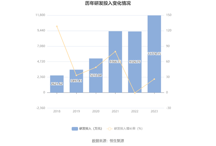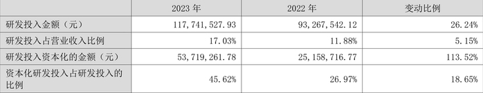 2023年全年,公司研发投入金额为1.18亿元,同比增长26.24%;研发投入占营业收入比例为17.03%,相比上年同期上升5.15个百分点。此外,公司全年研发投入资本化率为45.62%。