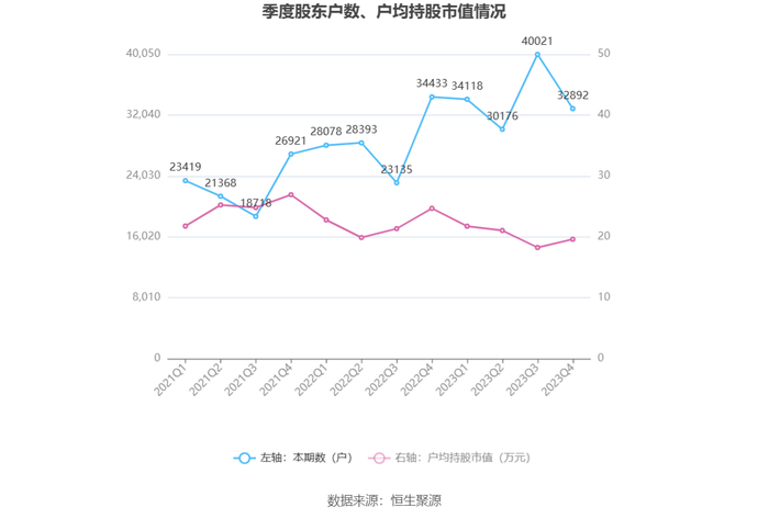筹码集中度方面,截至2023年年末,公司股东总户数为3.29万户,较三季度末下降了7129户,降幅17.81%;户均持股市值由三季度末的18.26万元上升至19.62万元,增幅为7.45%。