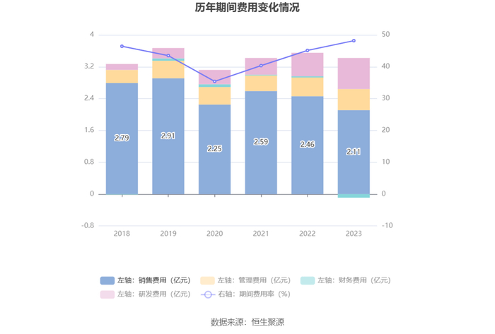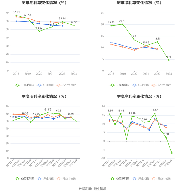 2023年,公司毛利率为54.98%,同比下降4.36个百分点;净利率为4.73%,较上年同期下降7.80个百分点。从单季度指标来看,2023年第四季度公司毛利率为49.69%,同比下降10.86个百分点,环比下降6.25个百分点;净利率为-6.85%,较上年同期下降18.28个百分点,较上一季度下降9.05个百分点。
