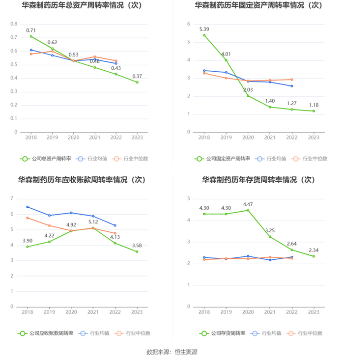 营运能力方面,2023年,公司公司总资产周转率为0.37次,上年同期为0.43次(2022年行业平均值为0.51次,公司位居同行业45/74);固定资产周转率为1.18次,上年同期为1.27次(2022年行业平均值为2.57次,公司位居同行业63/74);公司应收账款周转率、存货周转率分别为3.58次、2.34次。