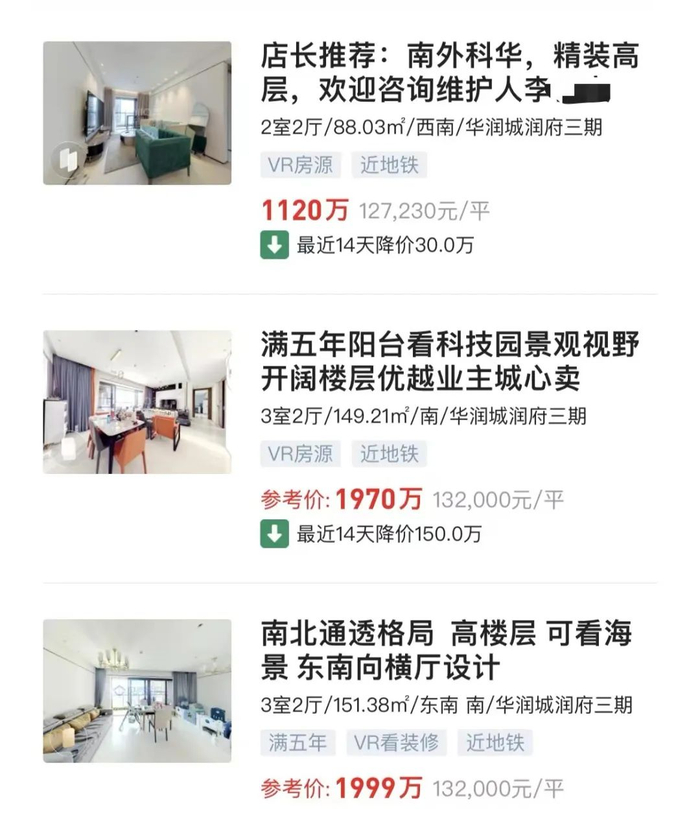链家平台的华润城润府三期在售房源中,多套房源近期有降价动作,降幅在19-150万元之间不等。