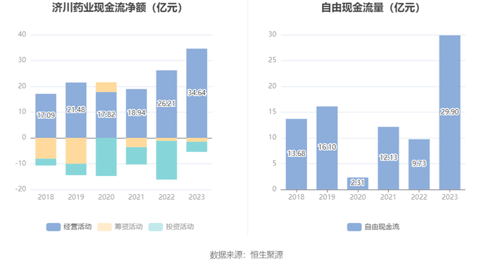 2023年,公司经营活动现金流净额为34.64亿元,同比增长32.17%;筹资活动现金流净额-1.51亿元,同比减少3310.70万元;投资活动现金流净额-3.94亿元,上年同期为-15.03亿元。