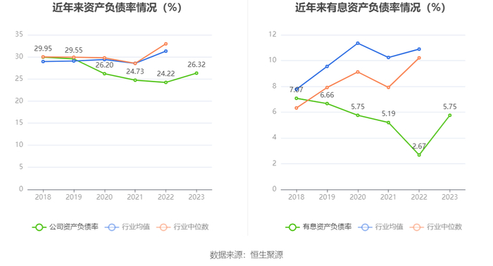 在偿债能力方面,公司2023年年末资产负债率为26.32%,相比上年末上升2.10个百分点;有息资产负债率为5.75%,相比上年末上升3.08个百分点。