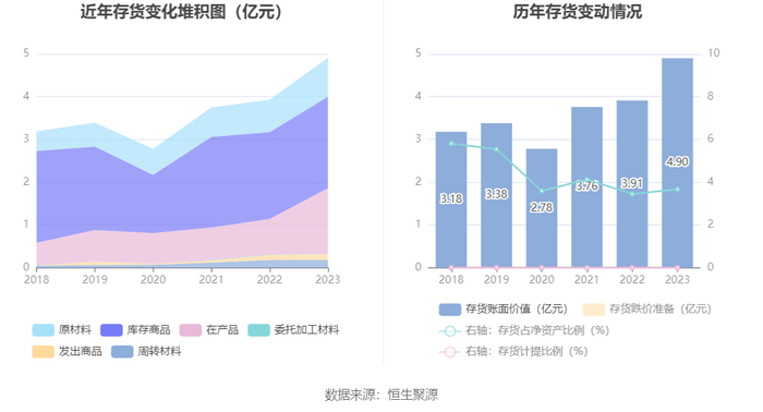 从存货变动来看,截至2023年年末,公司存货账面价值为4.9亿元,占净资产的3.67%。根据财报,公司本期没有计提存货跌价准备。
