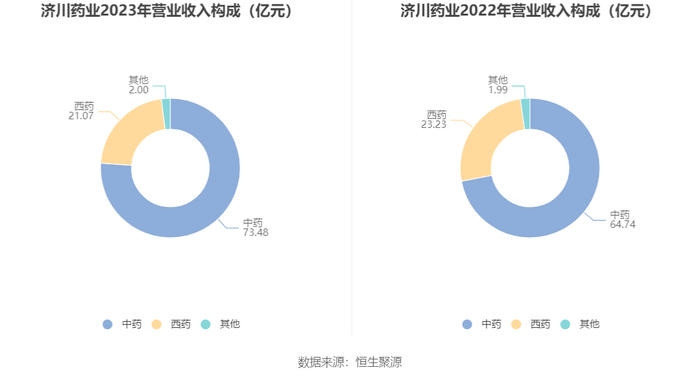 分产品来看,2023年公司主营业务中,中药收入73.48亿元,同比增长13.49%,占营业收入的76.11%;西药收入21.07亿元,同比下降9.29%,占营业收入的21.82%。