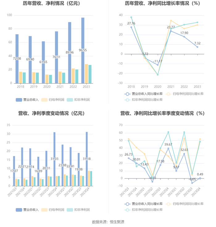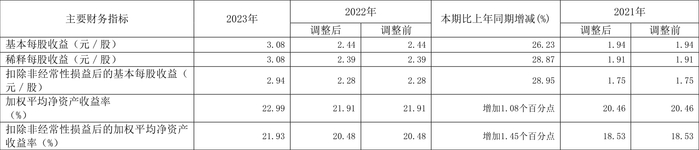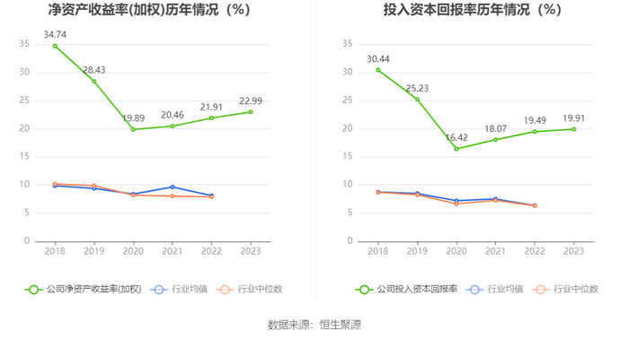 数据显示,2023年公司加权平均净资产收益率为22.99%,较上年同期增长1.08个百分点;公司2023年投入资本回报率为19.91%,较上年同期增长0.42个百分点。