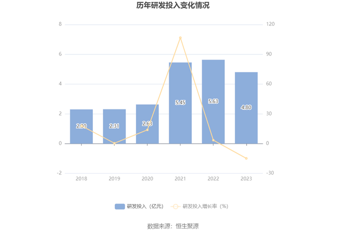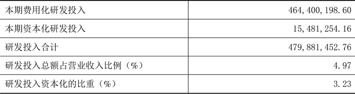 2023年全年,公司研发投入金额为4.80亿元,同比下降14.84%;研发投入占营业收入比例为4.97%,相比上年同期下降1.29个百分点。此外,公司全年研发投入资本化率为3.23%。