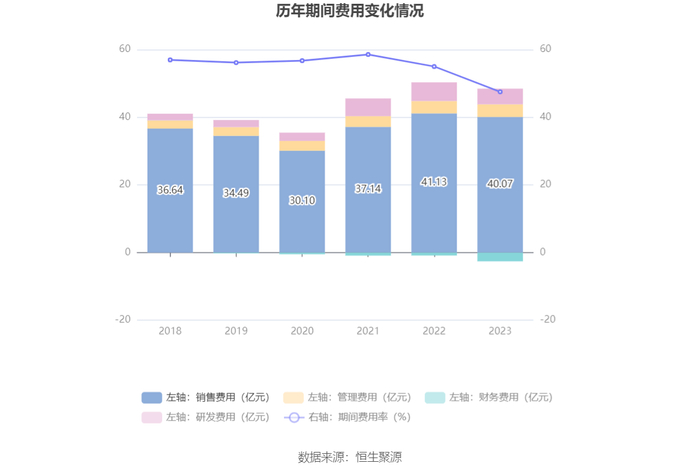 2023年,公司期间费用为45.86亿元,同比减少3.58亿元;期间费用率为47.5%,同比下降7.46个百分点。其中,销售费用同比下降2.58%,管理费用同比增长2.34%,研发费用同比下降16.07%,财务费用-2.57亿元,去年同期-8576.32万元。