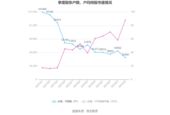 筹码集中度方面,截至2023年年末,公司股东总户数为3.29万户,较三季度末下降了1.01万户,降幅23.51%;户均持股市值由三季度末的58.54万元上升至87.96万元,增幅为50.26%。