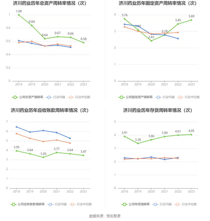 营运能力方面,2023年,公司公司总资产周转率为0.58次,上年同期为0.66次(2022年行业平均值为0.51次,公司位居同行业19/74);固定资产周转率为3.69次,上年同期为3.45次(2022年行业平均值为2.57次,公司位居同行业25/74);公司应收账款周转率、存货周转率分别为3.47次、4.05次。