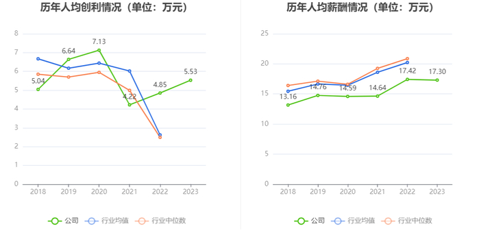 截至2023年末,公司员工总数为4344人,人均创收1986.97万元,人均创利5.53万元,人均薪酬17.30万元,较上年同期分别变化8.71%、14.08%、-0.71%。