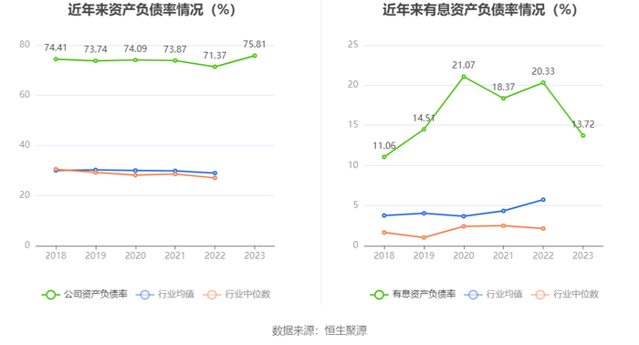 在偿债能力方面,公司2023年年末资产负债率为75.81%,相比上年末上升4.44个百分点;有息资产负债率为13.72%,相比上年末下降6.61个百分点。