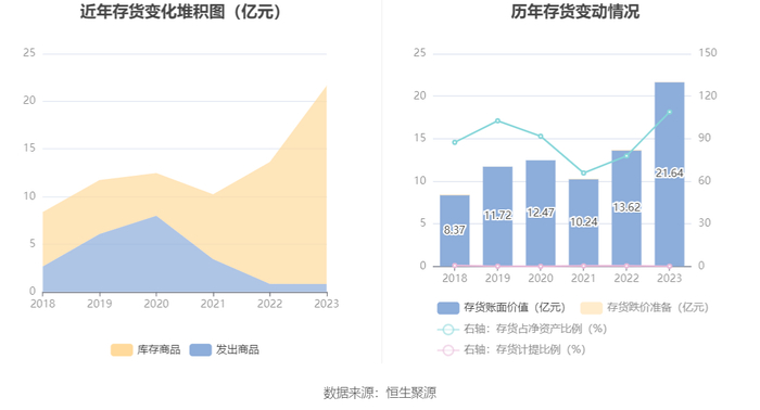从存货变动来看,截至2023年年末,公司存货账面价值为21.64亿元,占净资产的108.91%,较上年末增加8.02亿元。其中,存货跌价准备为180.5万元,计提比例为0.08%。
