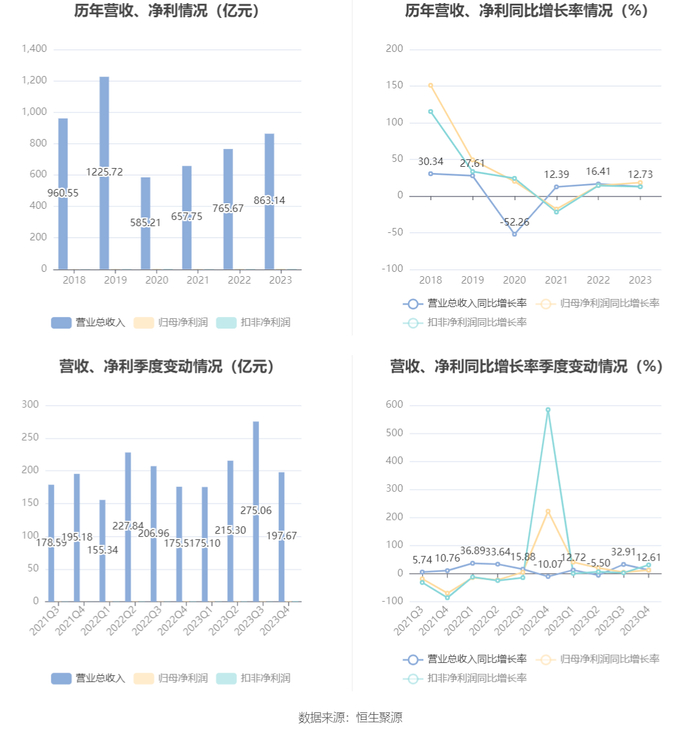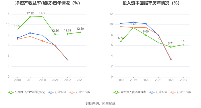 数据显示,2023年公司加权平均净资产收益率为12.80%,较上年同期增长0.48个百分点;公司2023年投入资本回报率为6.15%,较上年同期增长0.44个百分点。
