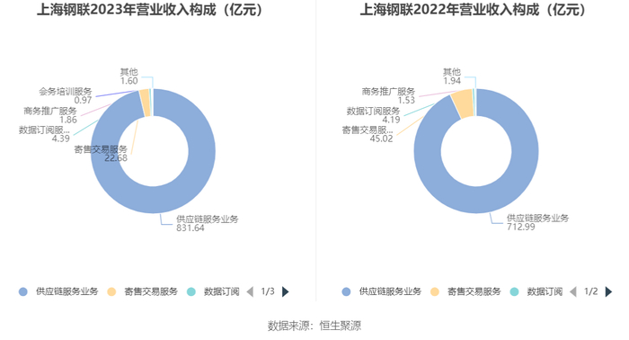 分产品来看,2023年公司主营业务中,供应链服务业务收入831.64亿元,同比增长16.64%,占营业收入的96.35%;寄售交易服务收入22.68亿元,同比下降49.62%,占营业收入的2.63%;数据订阅服务收入4.39亿元,同比增长4.79%,占营业收入的0.51%。