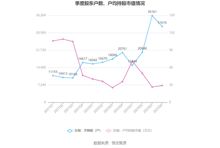 筹码集中度方面,截至2023年年末,公司股东总户数为3.16万户,较三季度末下降了4545户,降幅12.57%;户均持股市值由三季度末的26.52万元上升至29.00万元,增幅为9.35%。