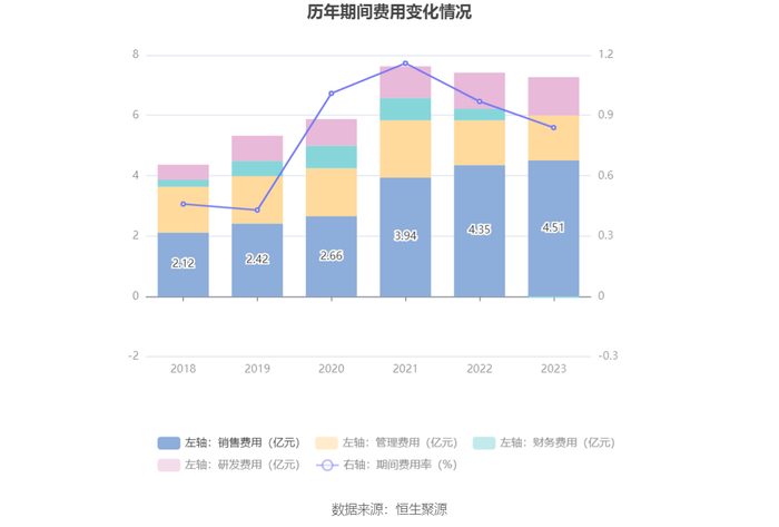 2023年,公司期间费用为7.23亿元,较上年同期减少1886.31万元;期间费用率为0.84%,较上年同期下降0.13个百分点。其中,销售费用同比增长3.82%,管理费用同比下降0.08%,研发费用同比增长5.79%,财务费用由去年同期的3780.25万元变为-449.85万元。