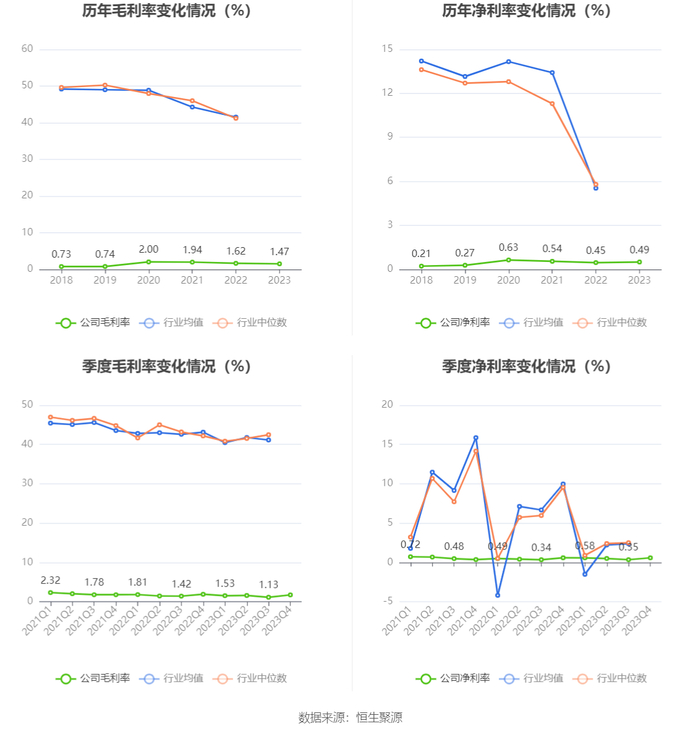 2023年,公司毛利率为1.47%,同比下降0.15个百分点;净利率为0.49%,较上年同期上升0.04个百分点。从单季度指标来看,2023年第四季度公司毛利率为1.74%,同比下降0.16个百分点,环比上升0.61个百分点;净利率为0.58%,较上年同期下降0.01个百分点,较上一季度上升0.23个百分点。