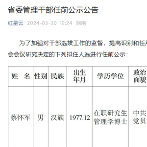 4月9日,湖南省委组织部发布的《省委管理干部任前公示公告》显示,湖南广播影视集团有限公司(湖南广播电视台)党委委员、副总经理、副台长蔡怀军,拟升任湖南省管企业正职。