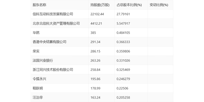 年报显示,2023年年末公司十大流通股东中,新进股东为法国兴业银行、令狐永兴、程跃明、汪治辛,取代了三季度末的凌顶守正十二号私募证券投资基金、凌顶玄嵩五号私募证券投资基金、万家成长优选灵活配置混合型证券投资基金、舒青青。在具体持股比例上,信科互动科技发展有限公司持股有所上升,香港中央结算有限公司、荣实持股有所下降。