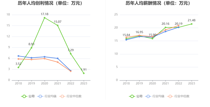 截至2023年末,公司员工总数为1906人,人均创收41.01万元,人均创利1.91万元,人均薪酬21.48万元,较上年同期分别变化-20.80%、-73.75%、6.38%。