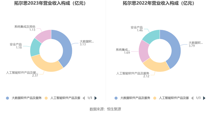 分产品来看,2023年公司主营业务中,大数据软件产品及服务收入3.13亿元,同比下降17.37%,占营业收入的40.11%;人工智能软件产品及服务收入2.37亿元,同比增长11.76%,占营业收入的30.32%;安全产品收入1.18亿元,同比下降19.07%,占营业收入的15.16%。