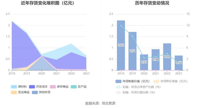 从存货变动来看,截至2023年年末,公司存货账面价值为6639.44万元,占净资产的1.98%。根据财报,公司本期没有计提存货跌价准备。