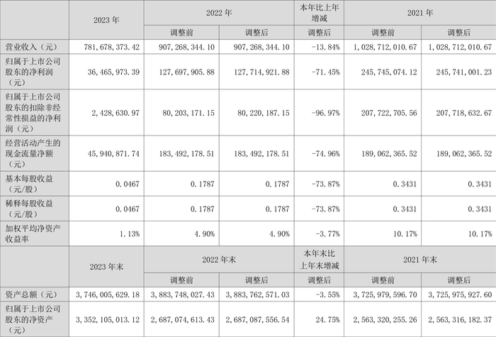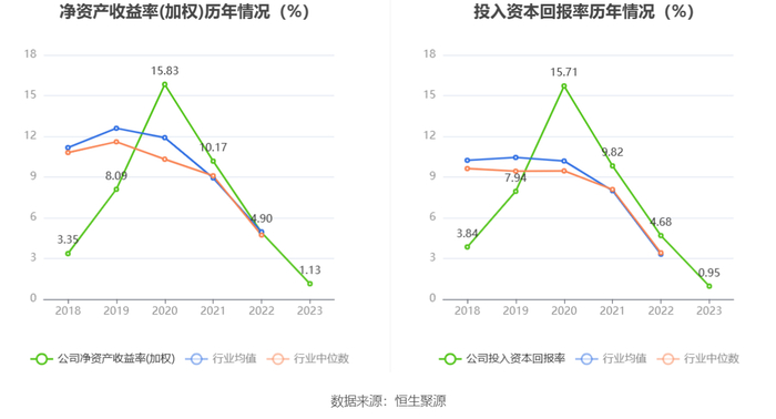 数据显示,2023年公司加权平均净资产收益率为1.13%,较上年同期下降3.77个百分点;公司2023年投入资本回报率为0.95%,较上年同期下降3.73个百分点。