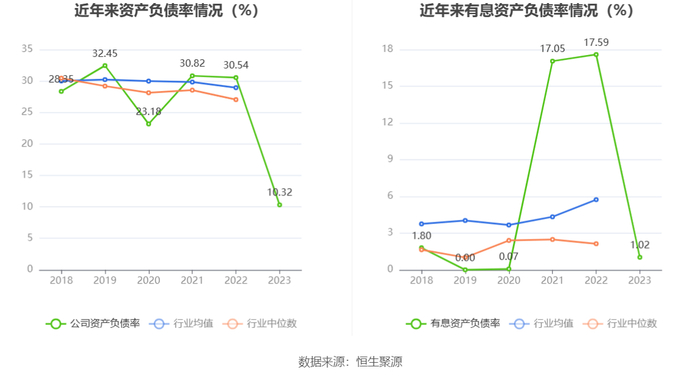 在偿债能力方面,公司2023年年末资产负债率为10.32%,相比上年末下降20.22个百分点;有息资产负债率为1.02%,相比上年末下降16.57个百分点。