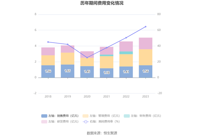 2023年,公司期间费用为5.04亿元,较上年同期增加4626.64万元;期间费用率为64.51%,较上年同期上升14.03个百分点。其中,销售费用同比增长10.63%,管理费用同比增长31.0%,研发费用同比增长15.4%,财务费用由去年同期的3540.94万元变为-81.43万元。