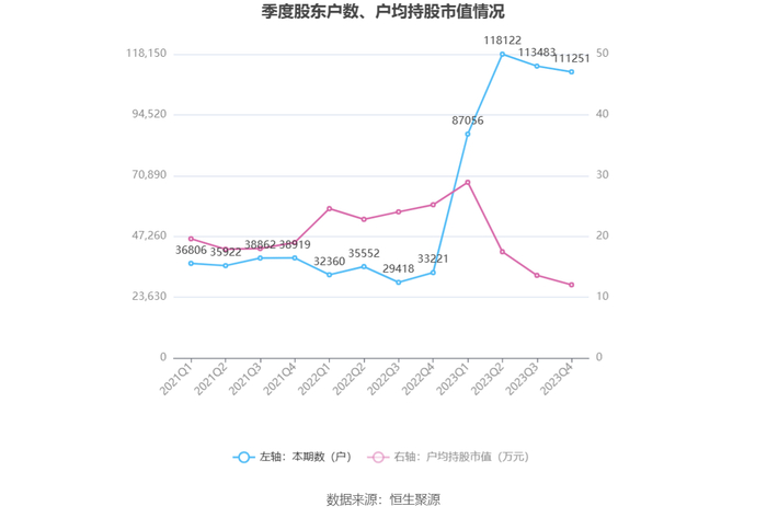 筹码集中度方面,截至2023年年末,公司股东总户数为11.13万户,较三季度末下降了2232户,降幅1.97%;户均持股市值由三季度末的13.60万元下降至12.05万元,降幅为11.40%。