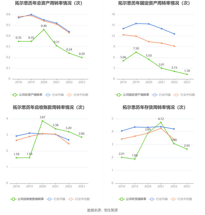 营运能力方面,2023年,公司公司总资产周转率为0.20次,上年同期为0.24次(2022年行业平均值为0.44次,公司位居同行业88/103);固定资产周转率为1.30次,上年同期为2.15次(2022年行业平均值为12.57次,公司位居同行业89/103);公司应收账款周转率、存货周转率分别为2.86次、2.65次。