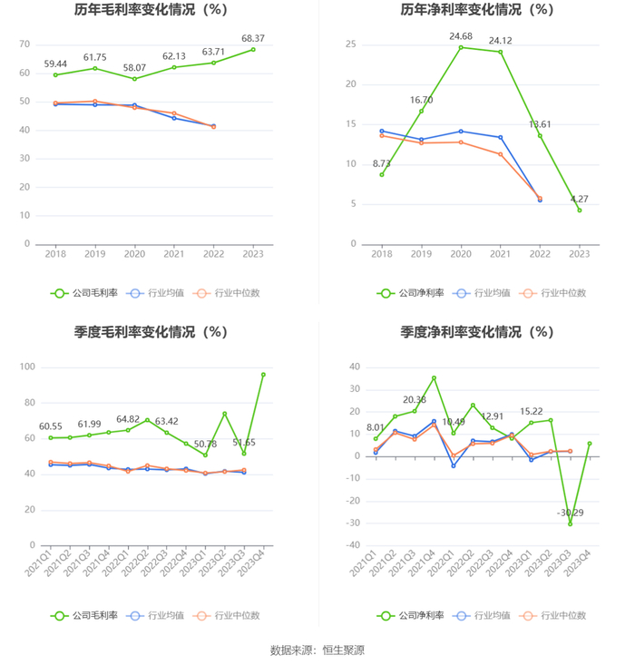 2023年,公司毛利率为68.37%,同比上升4.66个百分点;净利率为4.27%,较上年同期下降9.34个百分点。从单季度指标来看,2023年第四季度公司毛利率为95.99%,同比上升38.70个百分点,环比上升44.34个百分点;净利率为5.90%,较上年同期下降2.22个百分点,较上一季度上升36.19个百分点。