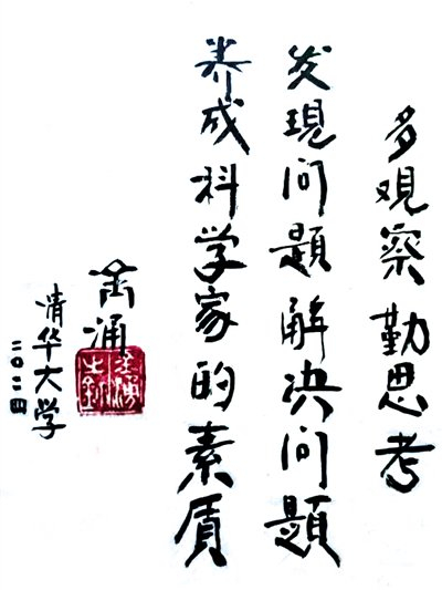 他常常在校园中闲逛,清华园中有一处地质之角,金涌记得有块石头上刻着爱因斯坦的名句,“每天我都无数次地提醒我自己,我的内心的和外在的生活,都是建立在其他活着的,和死去的人的劳动的基础上的,我必须竭尽全力,像我曾经得到的和正在得到的那样,做出同样的贡献”。