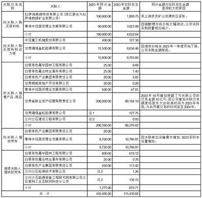 注:1.公司2023年预计与甘肃靖煤晶虹能源有限公司发生的采购、销售总金额为15,500万元,实际发生总金额为9,764.21万元,实际发生总金额在年度预计范围内。