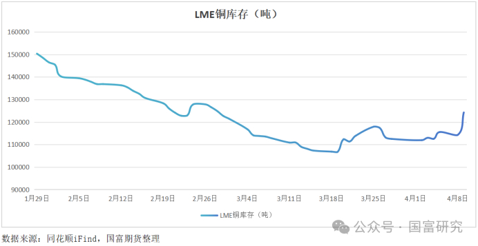 4月9日,LME铜库存录得12.42万吨,较上一日增加9950吨,增加幅度为8.71%;最近一周,LME铜库存累计增加1.23万吨,增加幅度为10.99%;最近一个月,LME铜库存累计增加1.14万吨,增加幅度为10.13%。历史数据显示,自2021年4月12日以来,LME铜库存最高为25.48万吨,最低为5.12万吨,均值录得12.57万吨,当前库存(12.42万吨)较均值减少1.16%