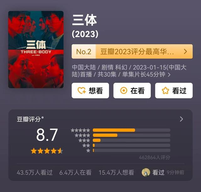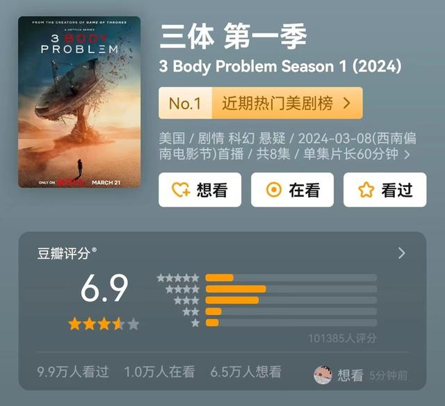 日前,奈飞版《三体》开播,在烂番茄网上获得76%的新鲜度和69%的观众爆米花指数。《三体》作为一部鲜有的由中国文学作品改编而成的海外剧集值得关注,但有腾讯版《三体》珠玉在前,奈飞版《三体》在国内的口碑不尽人意,豆瓣评分只有6.9。