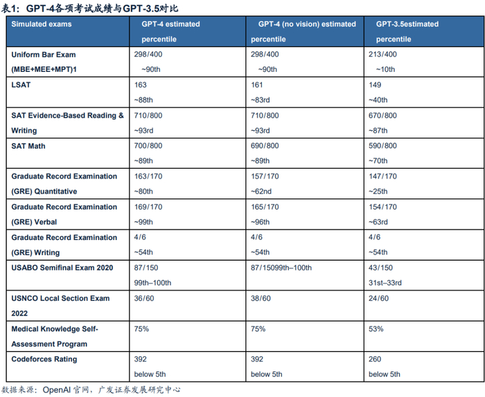 功能持续迭代,产品效果提升。从模型端的迭代来看,大模型的推理和理解能力迅速提升。以GPT-4和GPT3.5的对比为例,GPT-4在推理能力上明显有更好的表现。在SAT、GRE等通用考试中,GPT4均取得了较此前版本更好的性能表现。在功能端,GPT-4能更好的支持多模态,使AI可以更好的理解和生成文字、视频,图片、音乐等,大大提升了生成式AI的应用广度。我们预计,随着AI算法进步和输入语料的持续增加,AI大模型的逻辑推理能力还有望进一步强化。