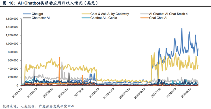 从移动端的应用和下载来看,Chatbot类应用呈现出“一超多强”的特点。Chatgpt获得了移动端大部分的下载量份额。据七麦数据,Chatgpt iOS端全球下载量预计达到百万级别,其次为Chat & Ask AI,后续多款AI Chat相关产品日下载量在10万次左右。