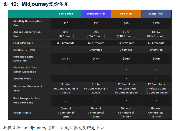 从图片生成领域来看,开源模型对行业有显著的贡献,但开源产品Stable Diffusion在商业化方向仍然面临一定困难。据Stable AI官网,公司原CEO,Emad Mostaque提出辞职,既不再担任CEO,也从公司董事会退出。与之对比,收费并通过的Discord进行私域运营的Midjourney则无需对外融资即可实现公司的健康发展。从Midjourney的定价体系来看,稳定的付费方式是偏向小B端的订阅制收费,通过大量中小创作者的稳定订阅,维持自身长期运营。