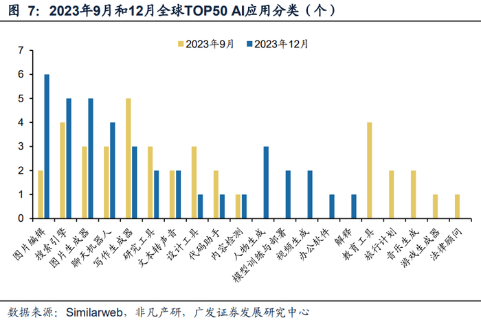 图像与设计、智慧搜索、聊天助手类别场景应用广泛。在2023年9月和12月全球AIGC应用分类Top50中,图片生成与编辑、智慧搜索、写作生成等AI类型的网站占比最高。在12月的统计中,围绕着图像的生成与编辑有11家,高于其他类目,反映了图像生成技术的成熟度提升,用户使用习惯逐步形成;智慧搜索大类有5家,得益于Bing等搜索引擎的创新,用户越来越倾向于使用能够理解复杂查询并提供精准结果的搜索工具。智慧搜索通过运用自然语言处理、机器学习和语义理解等技术,能够更好地理解用户的意图,根据用户的上下文和偏好提供更符合需求的搜索结果;AI聊天类别共有4家,显示出人们对于个人聊天和助手功能的旺盛需求。